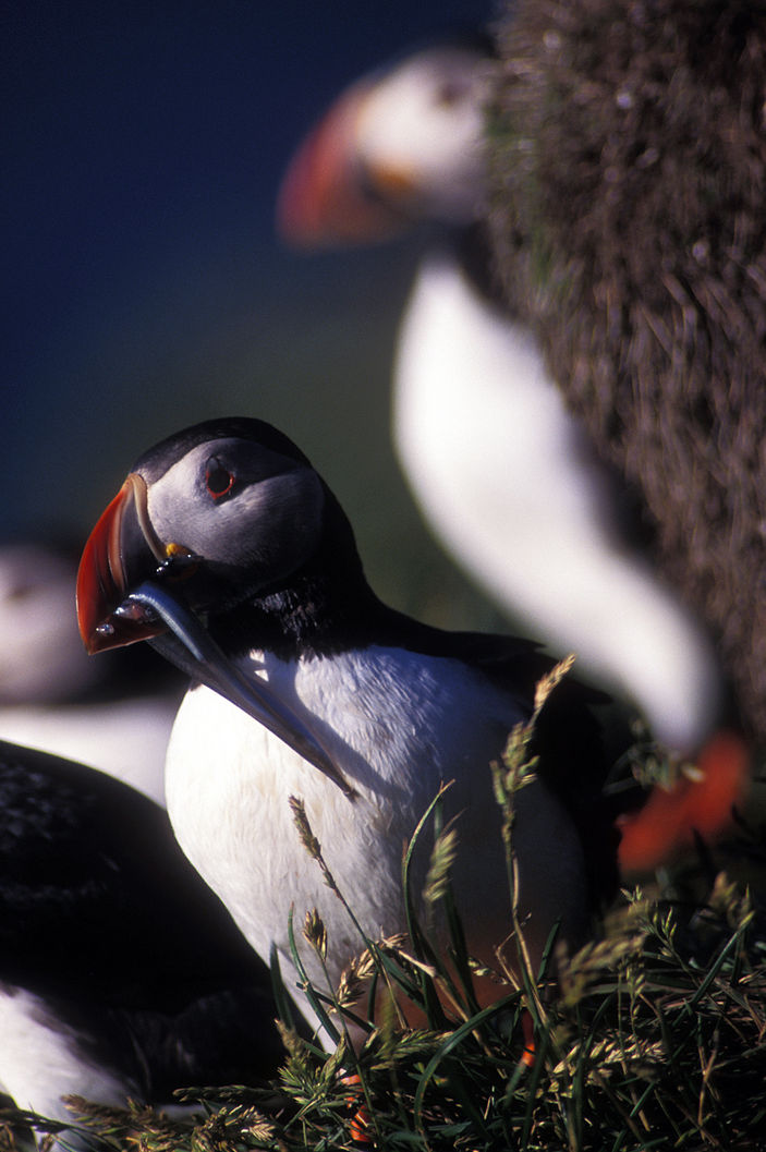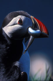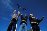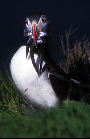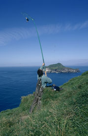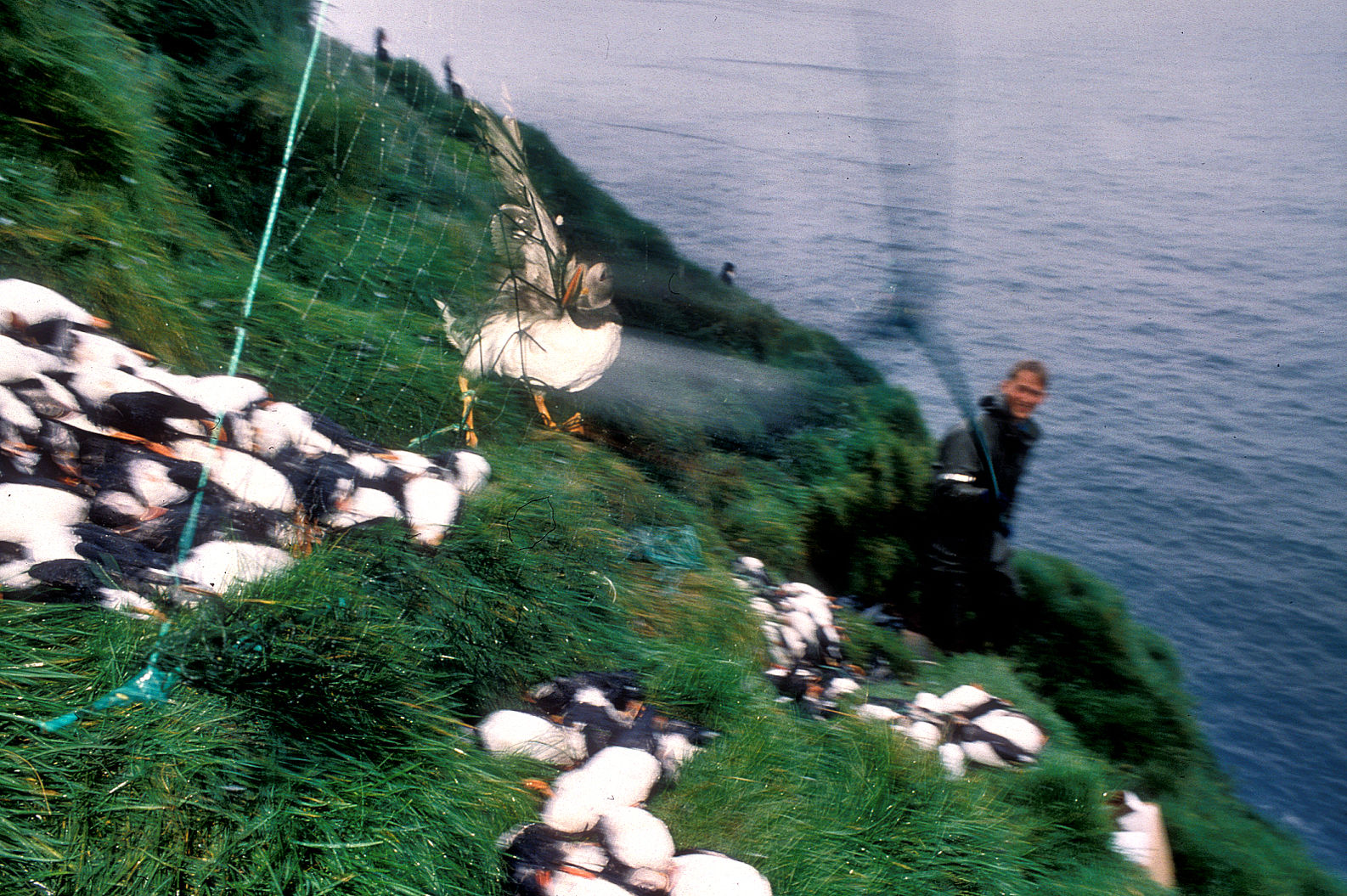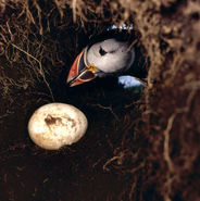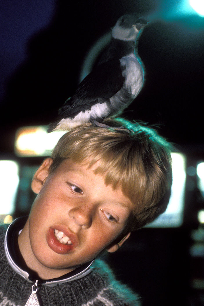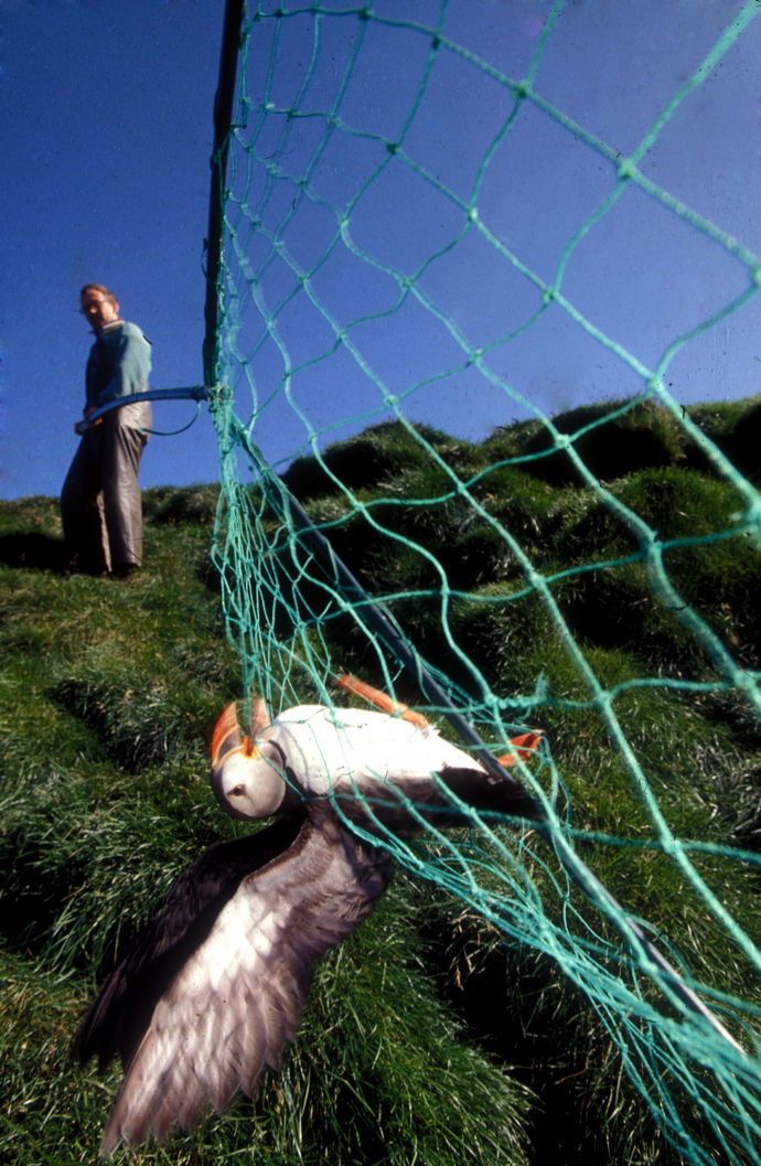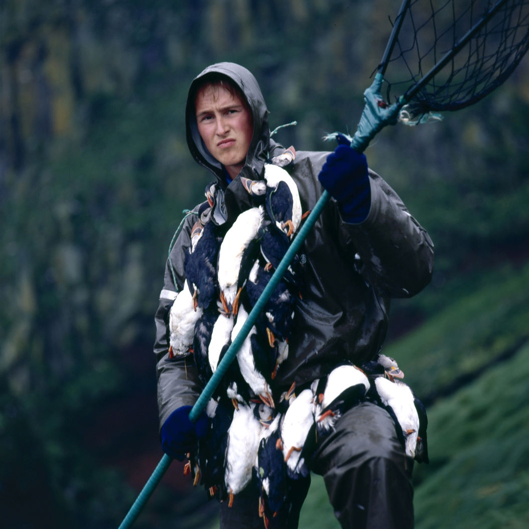 Aux Vestmann, la chasse aux macareux à ses règles, seuls les mâles sont visés, uniquement en juillet. Honte à celui qui à celui qui chasserait les nouveaux nés tapis au fond des terriers. Le macareux est le seul oiseau européen à creuser, de son bec et de ses pattes, un profond nid terrier pour y abriter son oeuf. Armé d'une longue épuisette, le chasseur n'a aucun mal à attraper sa proie, 40000 macareux se laissent piéger chaque mois de juillet. Chaque mois d'août, pendant leur baptême de l'air, les oisillons s'echouent dans la ville ou les enfants les attendent pour une mission de sauvetage.